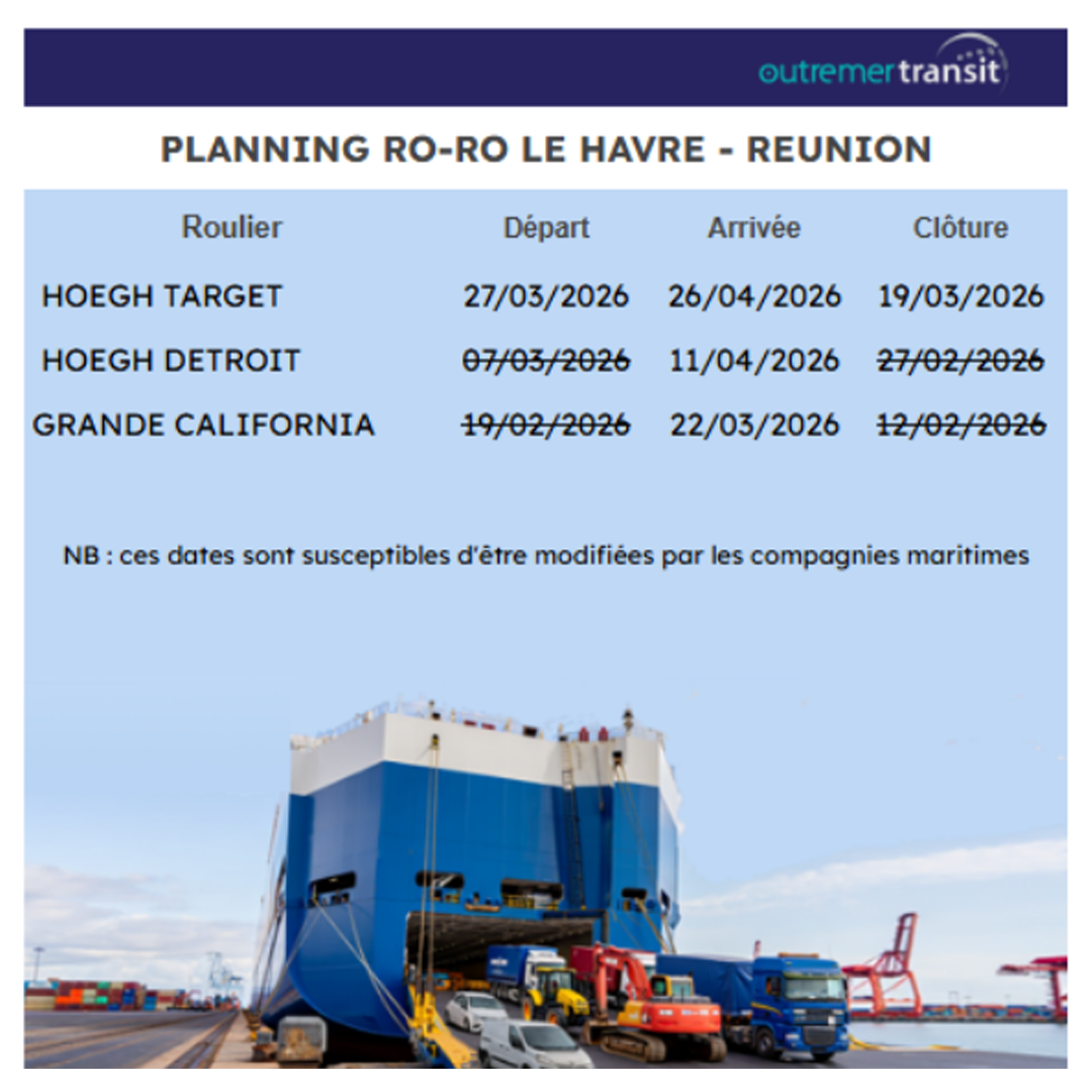 Les prochaines dates pour transporter votre voiture, véhicule utilitaire, camping-car, tracteur routier, engin agricole ... en navire roulier de la France Métropole vers la Réunion